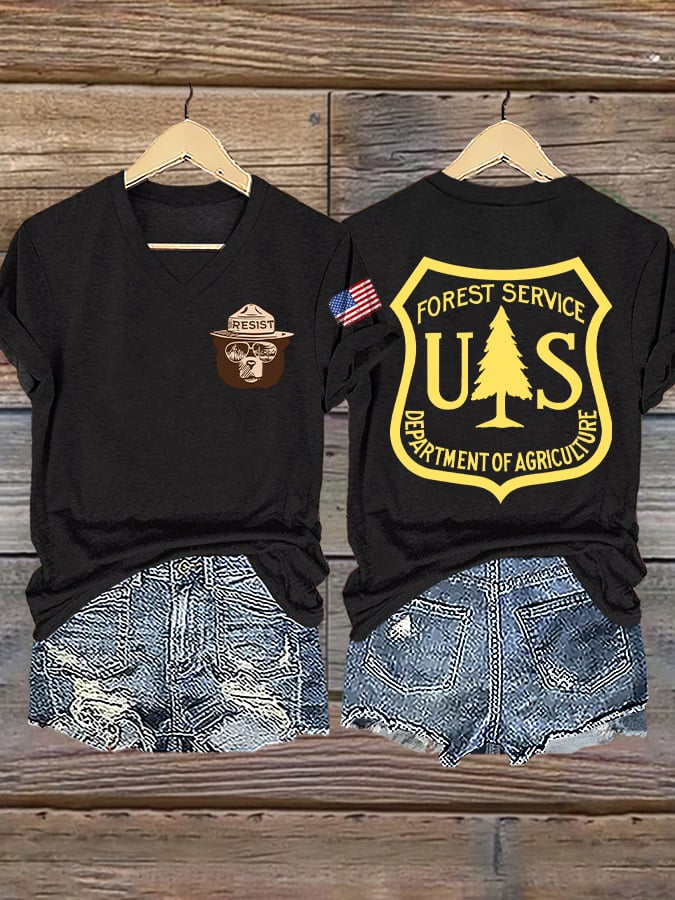 V-Neck Retro Resist Save The Forest Service Print T-Shirt